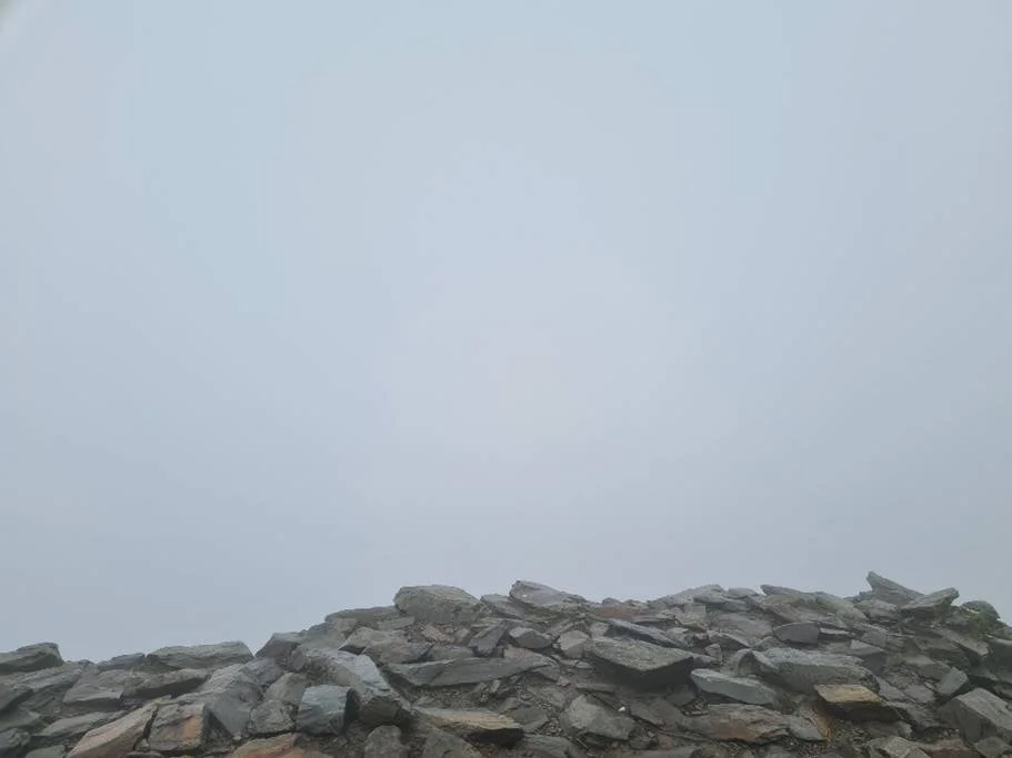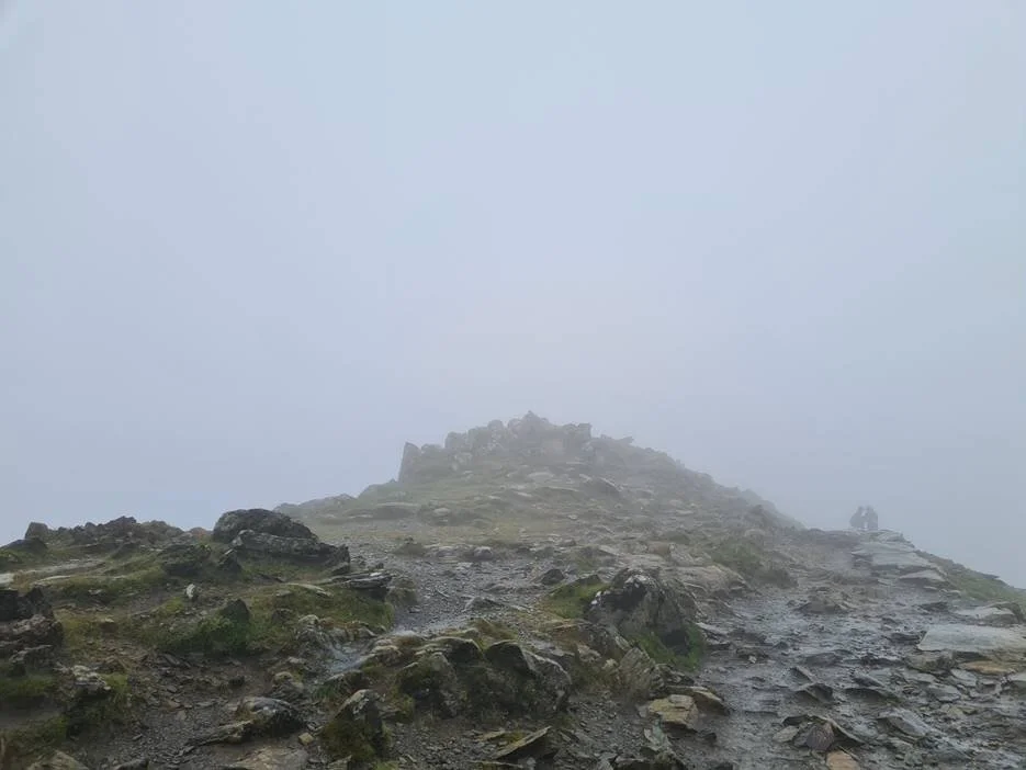When we finally reached the summit, we arrived at some steps and had to scramble up them due to the driving wind and rain. We made it!